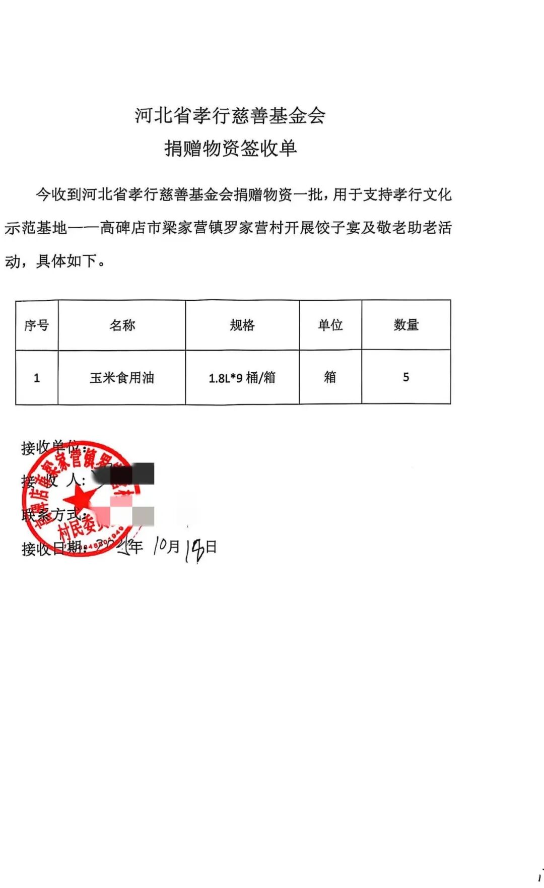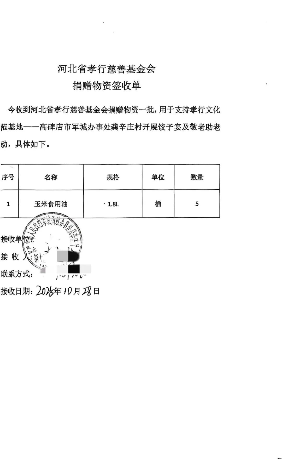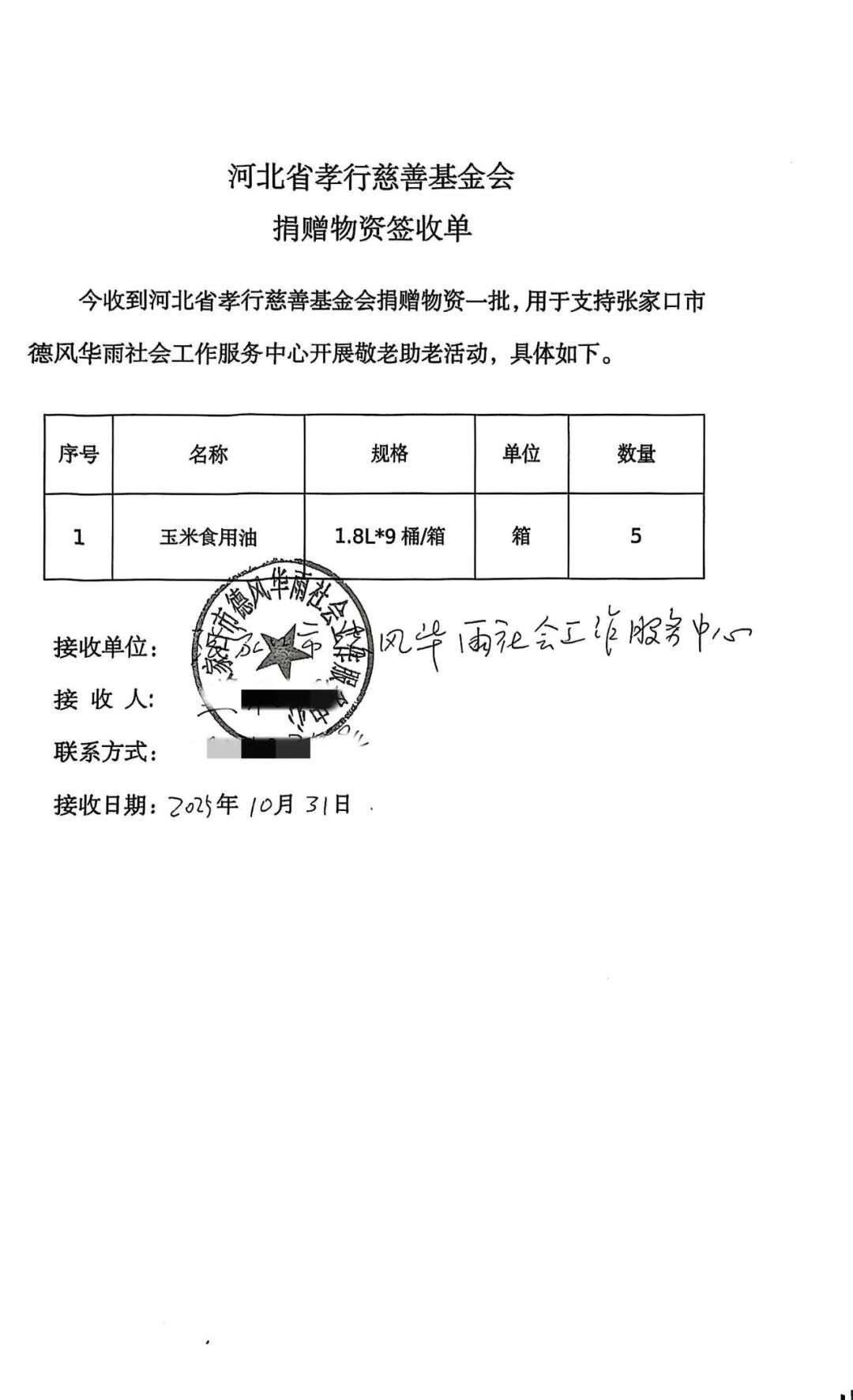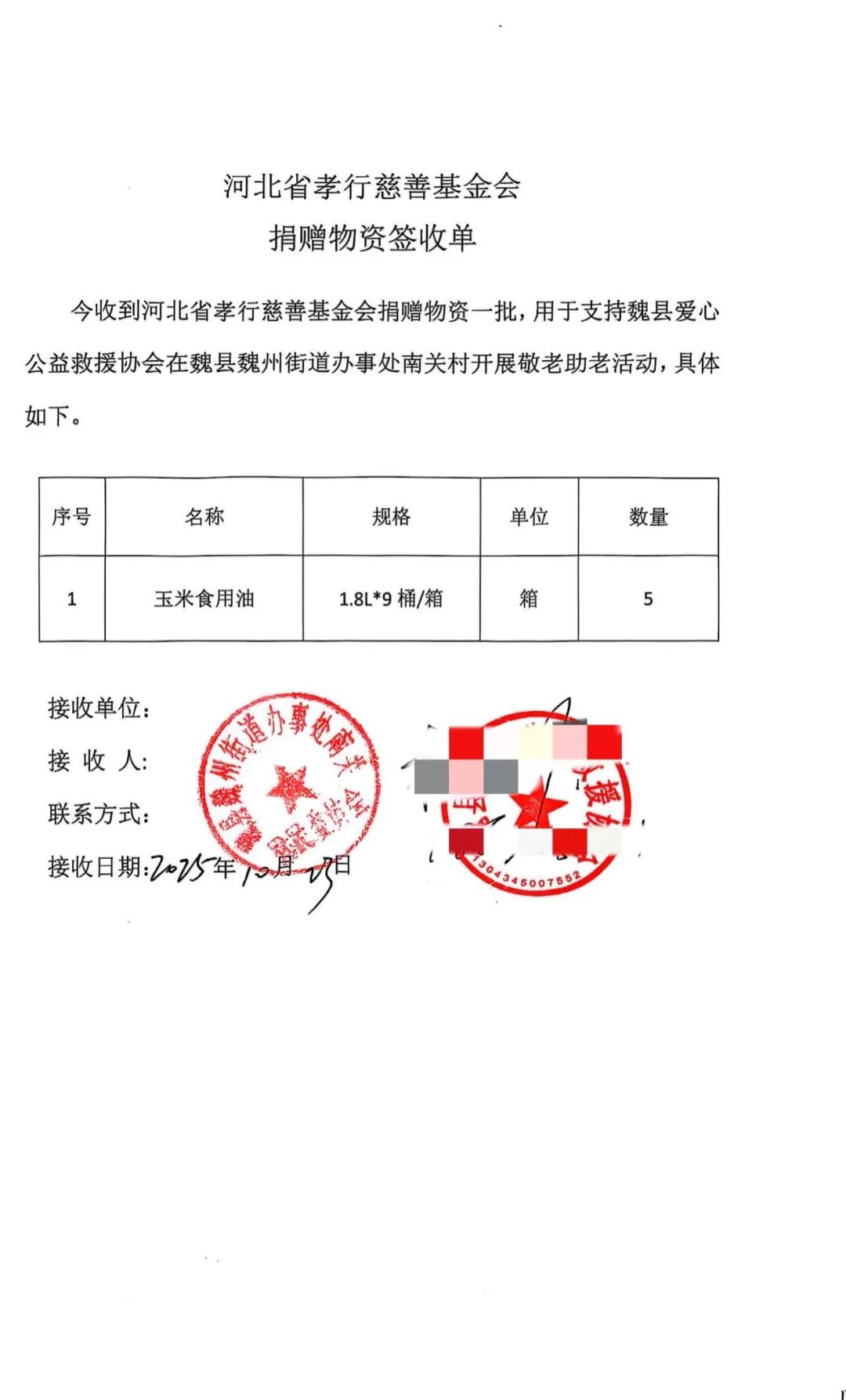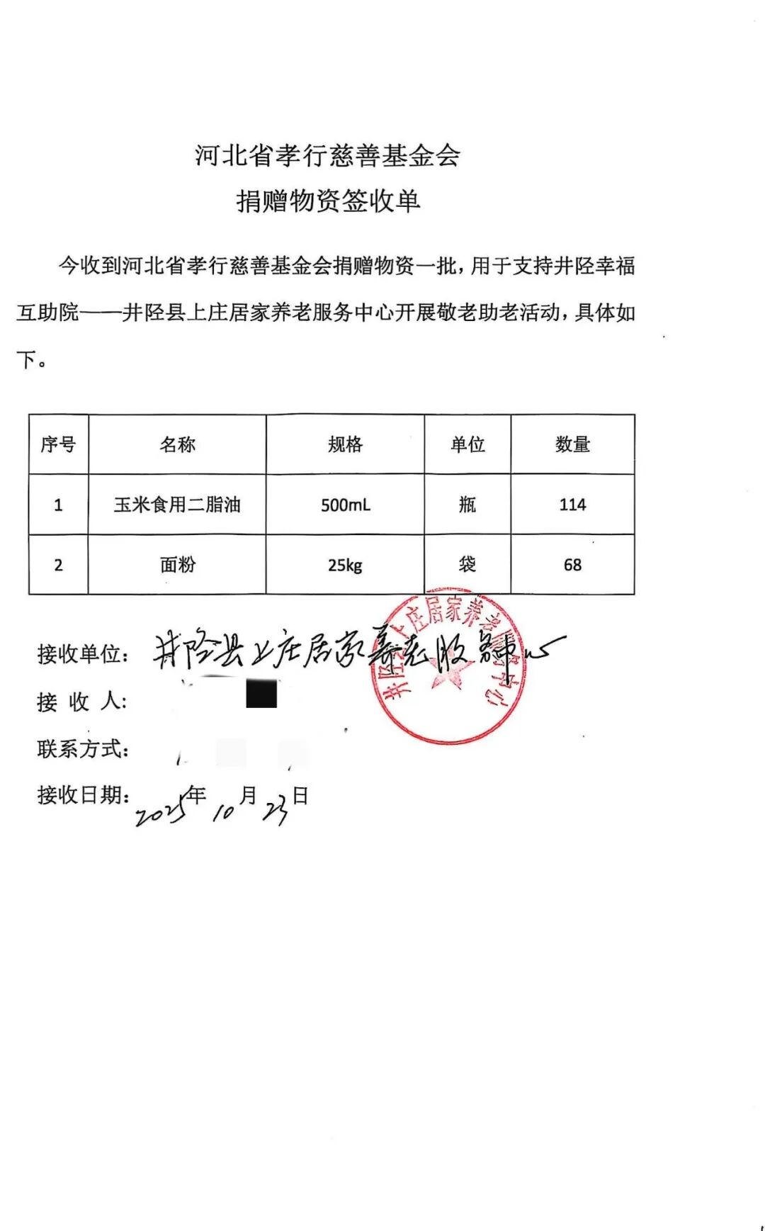 向井陉幸福互助院捐赠7980元的二酯玉米食用油,用于互助院老人日常用餐,物资由吉林旭鑫油脂有限公司提供。